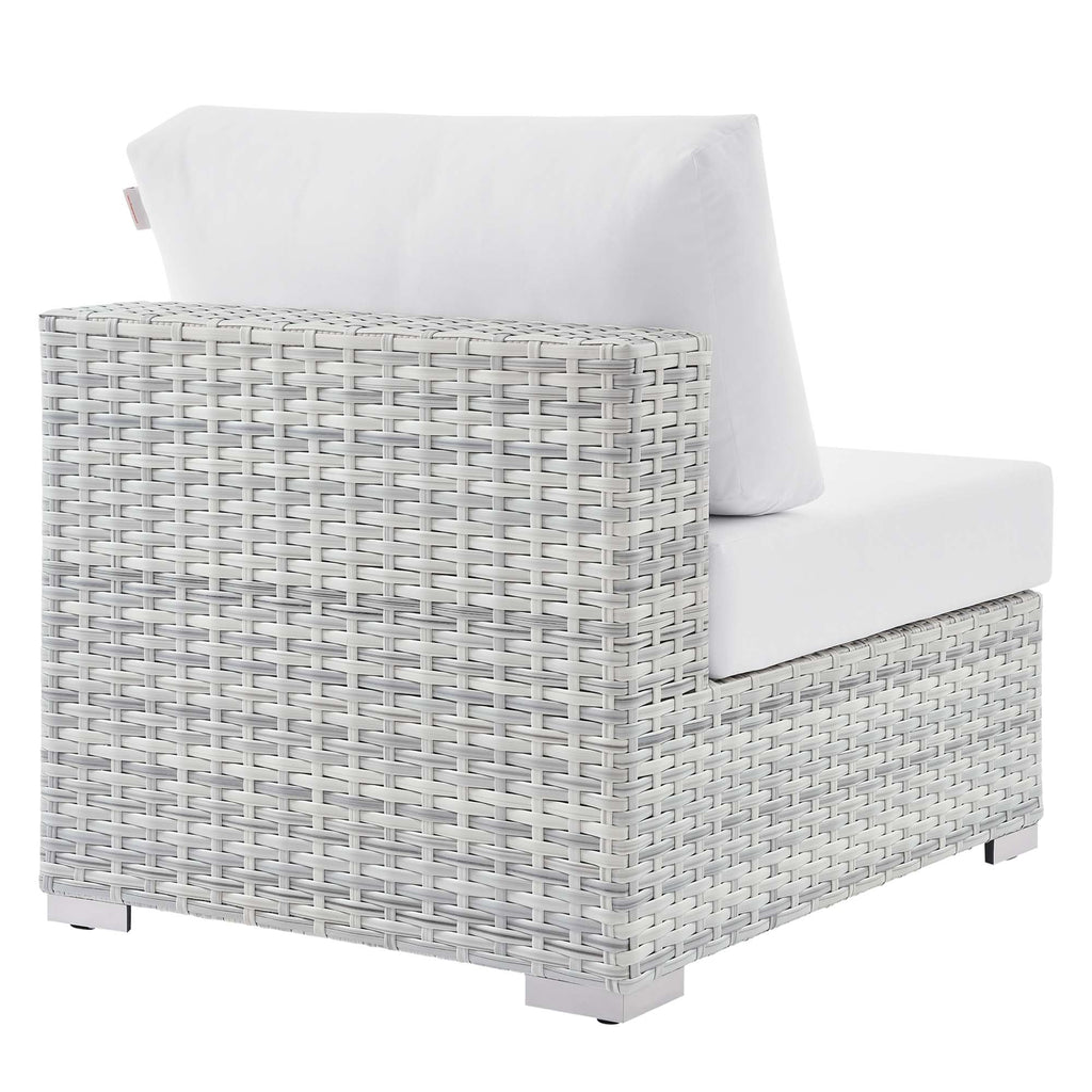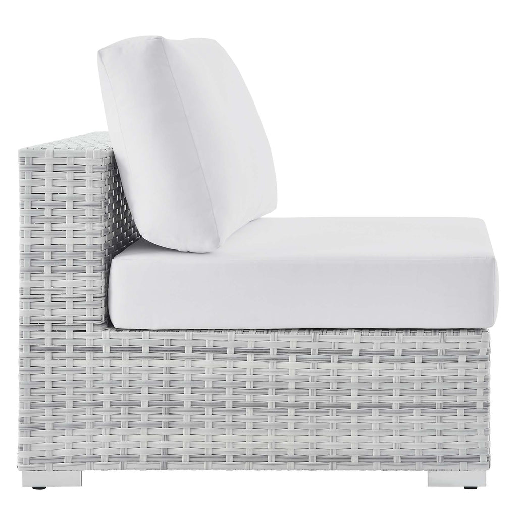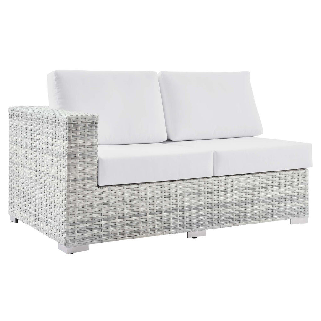 Gather stages of sensitivity with the Convene Outdoor Series. Made with a synthetic rattan weave and a powder-coated aluminum frame, Convene is a versatile outdoor furniture set that shifts and combines according to the spontaneous needs of the moment. Outfitted with all-weather fabric cushions, the Convene Sectional Set leaves a positive impression on friends and family while enhancing your patio, backyard, or poolside retreat with palpable distinction. This outdoor patio furniture set includes one armless chair, one left-arm loveseat, one right-arm chaise, and a coffee table. Set Includes: One - Convene Armless Chair One - Convene Coffee Table One - Convene Left-Arm Loveseat One - Convene Right Chaise