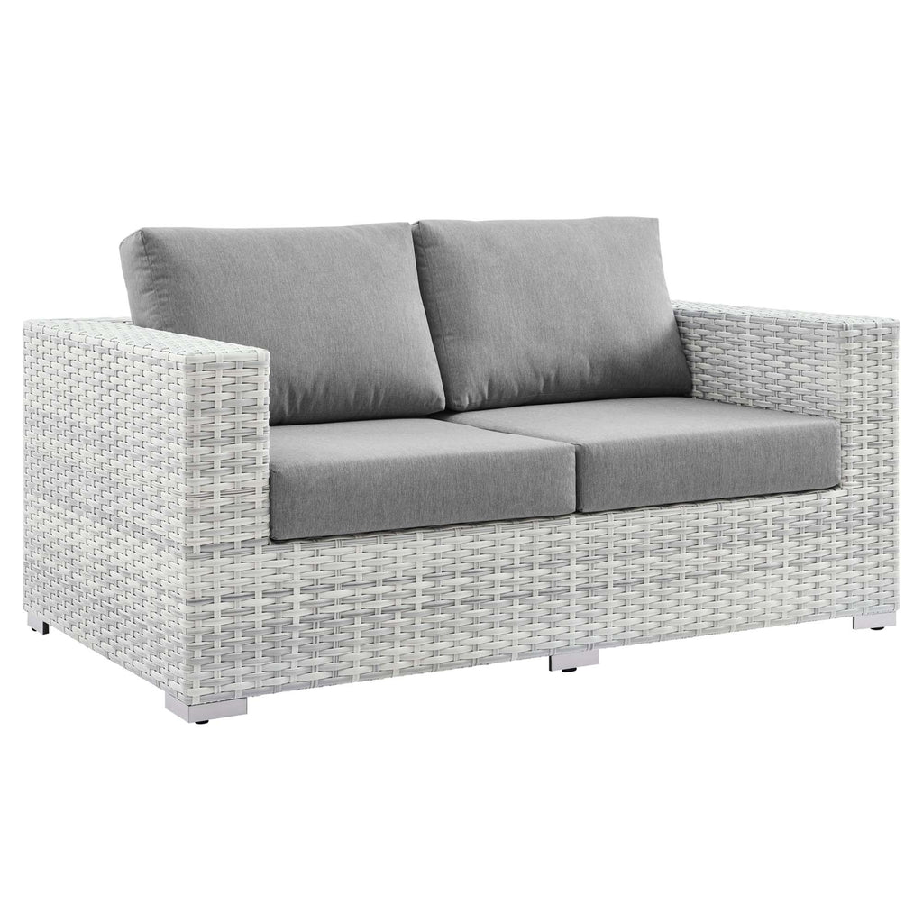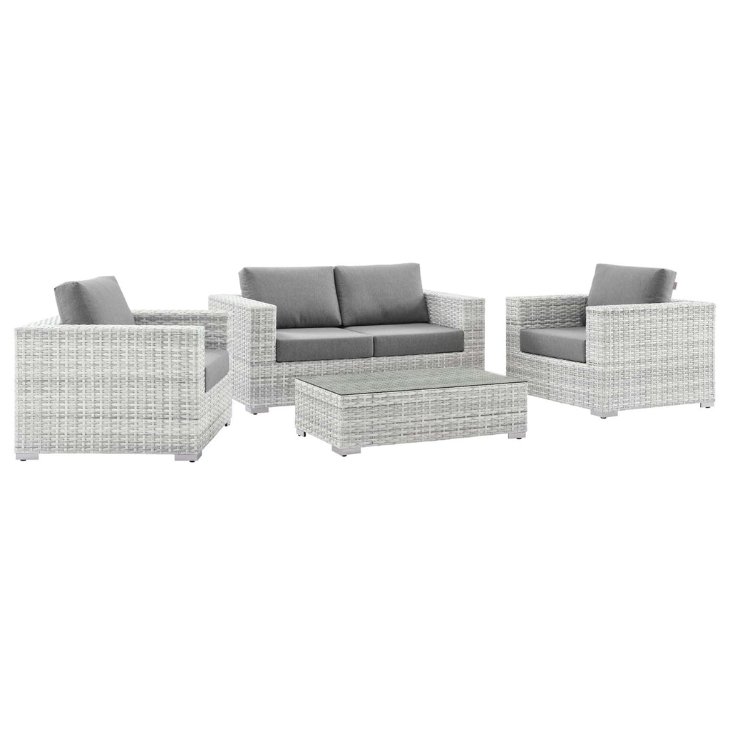 Gather stages of sensitivity with the Convene Outdoor Series. Made with a synthetic rattan weave and a powder-coated aluminum frame, Convene is a versatile outdoor furniture set that shifts and combines according to the spontaneous needs of the moment. Outfitted with all-weather fabric cushions, the Convene Sectional Set leaves a positive impression on friends and family while enhancing your patio, backyard, or poolside retreat with palpable distinction. This outdoor patio furniture set includes two armchairs, a loveseat, and a coffee table. Set Includes: One - Convene Coffee Table One - Convene Loveseat Two - Convene Armchair