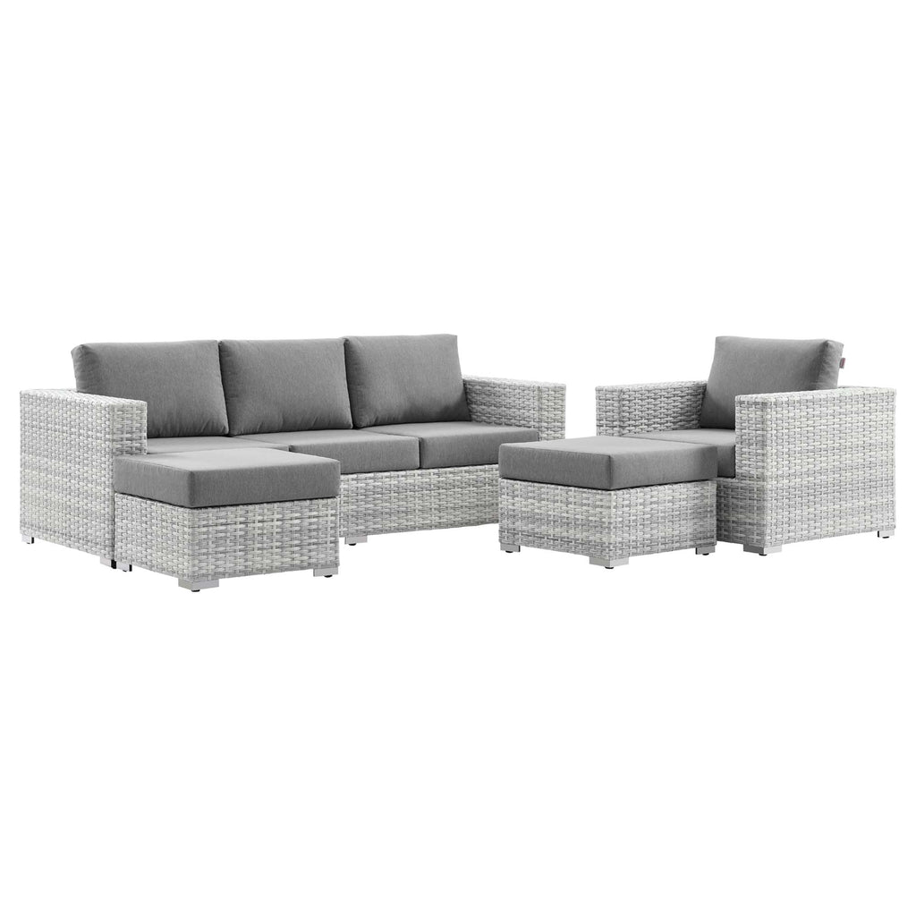 Gather stages of sensitivity with the Convene Outdoor Series. Made with a synthetic rattan weave and a powder-coated aluminum frame, Convene is a versatile outdoor furniture set that shifts and combines according to the spontaneous needs of the moment. Outfitted with all-weather fabric cushions, the Convene Sectional Set leaves a positive impression on friends and family while enhancing your patio, backyard, or poolside retreat with palpable distinction. This outdoor patio furniture set includes one armchair, two ottomans, and one sofa. Set Includes: One - Convene Armchair One - Convene Sofa Two - Convene Ottoman