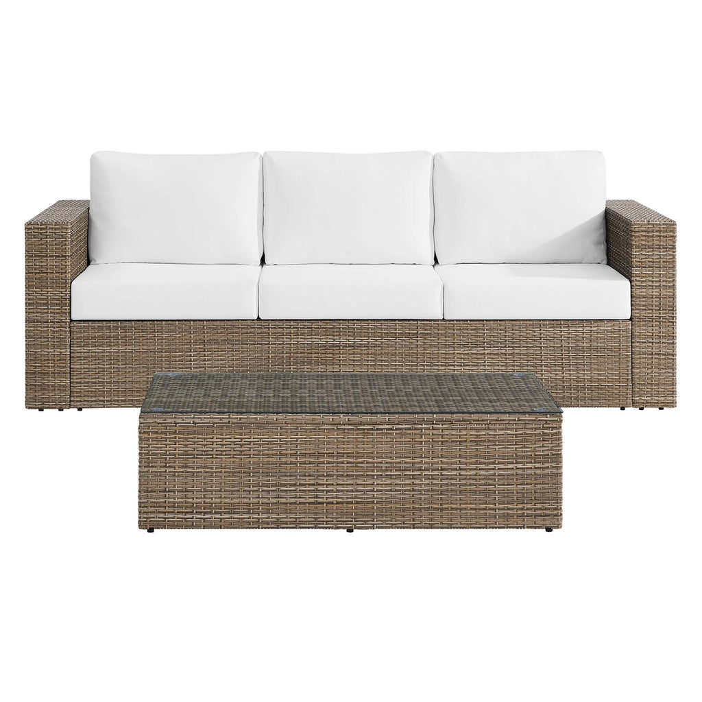 Surround yourself with warm weather and good company with the Convene Outdoor Collection. Made with synthetic rattan weave and powder-coated aluminum frames, this outdoor sofa and coffee table set leaves a positive impression on your guests while enhancing your patio, backyard, porch, or poolside with modern style and appreciated texture. A lasting all-weather addition to your outdoor space, this patio sofa is complete with dense foam padded cushions with water-resistant zippered covers and non-marking foot pads to protect your flooring. The outdoor coffee table features an easy-to-clean tempered glass top. Assembly required. Easy to follow instructions included. Set Includes: 1 Sofa, 1 Coffee Table Set Includes: One - Convene Outdoor Patio Coffee Table One - Convene Outdoor Patio Sofa