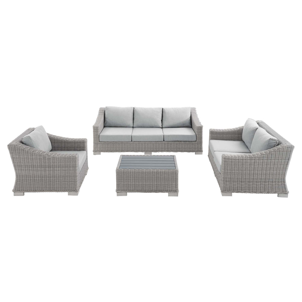 Enjoy fresh air and alfresco relaxation with the Conway Outdoor Patio Sunbrella� Wicker Rattan 4-Piece Furniture Set. Wrapped in UV-resistant light gray synthetic wicker rattan, this patio furniture set boasts organic texture and a neutral hue that brings a calming presence to your outdoor space. The frame of this outdoor furniture set and outdoor ottoman are crafted with durable powder-coated aluminum and rest on L-shaped legs with plastic foot glides. Thick foam padded cushions covered with washable water-resistant Sunbrella� covers offer a comfortable seat and affix securely to the lounge chair with cord tension attachments. Trending aesthetics and a classic design define this outdoor patio furniture collection making it a beautiful addition to any outdoor space including the backyard, patio, porch, balcony, or poolside. Assembly required. Set Includes: Sofa, Loveseat, Armchair, Coffee Table Set Includes: One - Conway 32" Coffee Table One - Conway Sunbrella� Armchair One - Conway Sunbrella� Loveseat One - Conway Sunbrella� Sofa