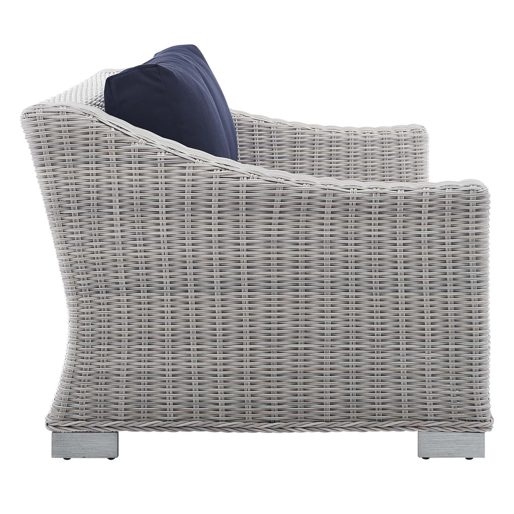 Enjoy fresh air and alfresco relaxation with the Conway Outdoor Patio Sunbrella� Wicker Rattan 4-Piece Furniture Set. Wrapped in UV-resistant light gray synthetic wicker rattan, this patio furniture set boasts organic texture and a neutral hue that brings a calming presence to your outdoor space. The frame of this outdoor furniture set and outdoor ottoman are crafted with durable powder-coated aluminum and rest on L-shaped legs with plastic foot glides. Thick foam padded cushions covered with washable water-resistant Sunbrella� covers offer a comfortable seat and affix securely to the lounge chair with cord tension attachments. Trending aesthetics and a classic design define this outdoor patio furniture collection making it a beautiful addition to any outdoor space including the backyard, patio, porch, balcony, or poolside. Assembly required. Set Includes: Sofa, Loveseat, Armchair, Coffee Table Set Includes: One - Conway 32" Coffee Table One - Conway Sunbrella� Armchair One - Conway Sunbrella� Loveseat One - Conway Sunbrella� Sofa