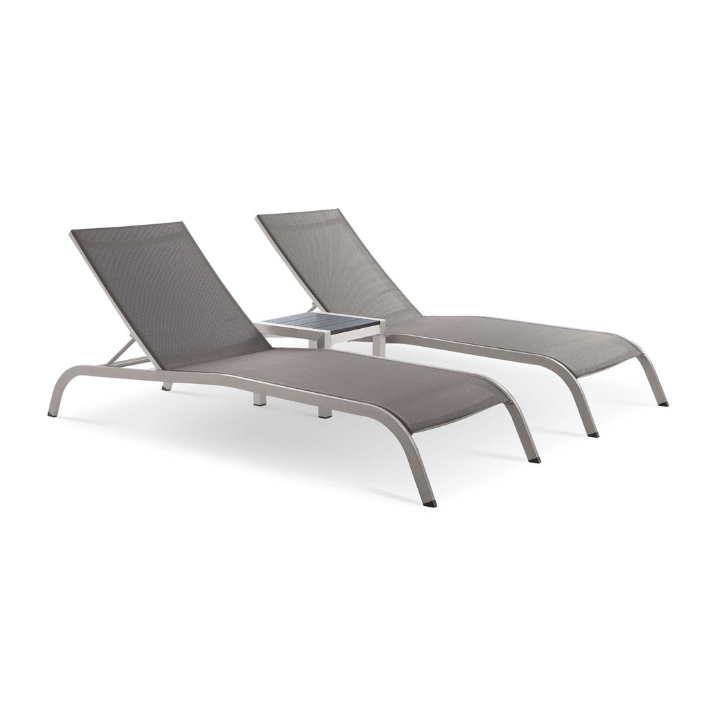 Energize your patio decor with the versatile vintage glamour Savannah Outdoor Patio Mesh Chaise Lounge Chair Set with Side Table. A sleek design that evokes a retro-modern feel, Savannah chaise lounge chairs feature all-weather Textilene mesh fabric that creates a breathable fabric for a pleasant outdoor lounging experience. Complete with an anodized matte aluminum frame with non-marking foot caps, these deceptively simple pieces create an aura of vintage glamour in your patio decor. This set of elegant outdoor sun loungers is a perfect addition to the backyard, poolside, porch, deck, or balcony. Chair Weight Capacity: 661 lbs. Set Includes: One - Shore Side Table Two - Savannah Outdoor Patio Mesh Chaise Lounge Chair