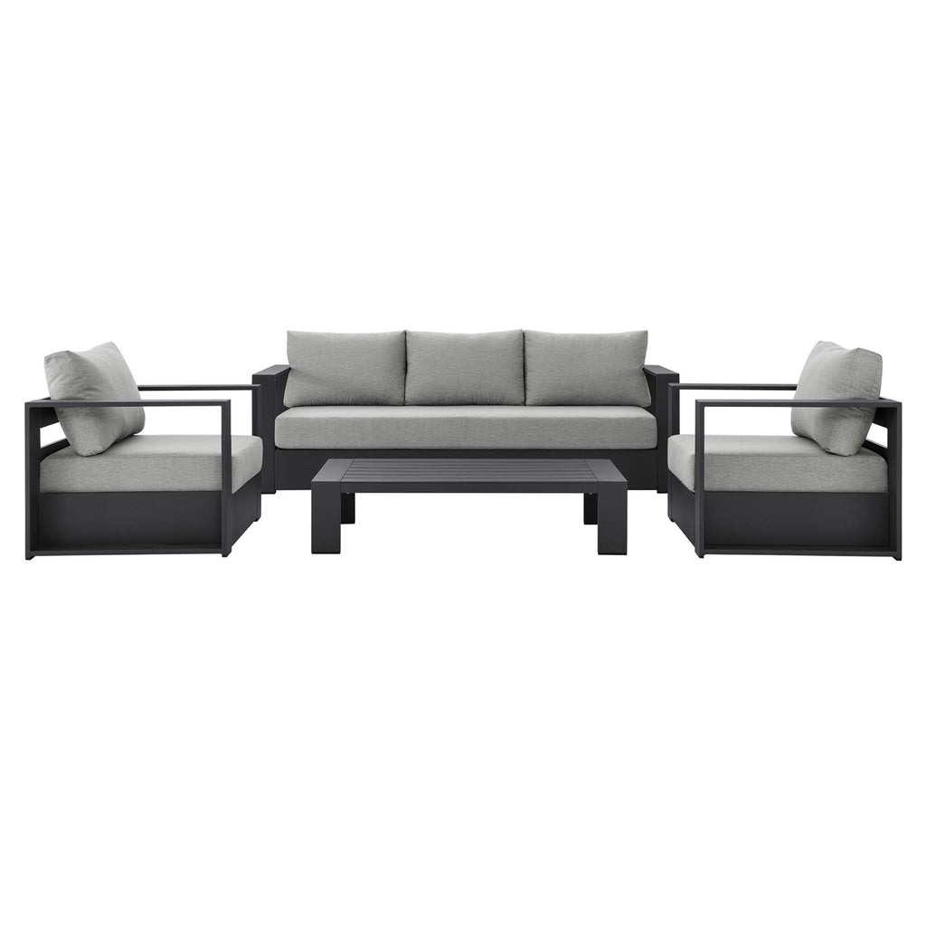 Enliven your alfresco spaces with the Tahoe Aluminum 4-Piece Outdoor Patio Set. This modern outdoor patio set includes two armchairs, a sofa, and a coffee table, crafted with durable powder-coated aluminum, dispensing contemporary elegance in your outdoor lounge spaces. The Tahoe 4-Piece Patio Set is perfect for poolside lounging with a sunproof, water-resistant fabric-covered seat and backrest. With dense foam padding for sustaining comfort and removable, stain-resistant cushions on the sofa and armchairs, this patio set is low maintenance and high performing. A durable patio set, Tahoe comes with easy-to-follow assembly instructions and features non-marking foot glides to protect your deck or patio floor. Weight Capacity - Chair: 331 lbs. Sofa: 993 lbs. Set Includes: One - Tahoe Powder Coffe Table One - Tahoe Powder Sofa Two - Tahoe Powder Armchair