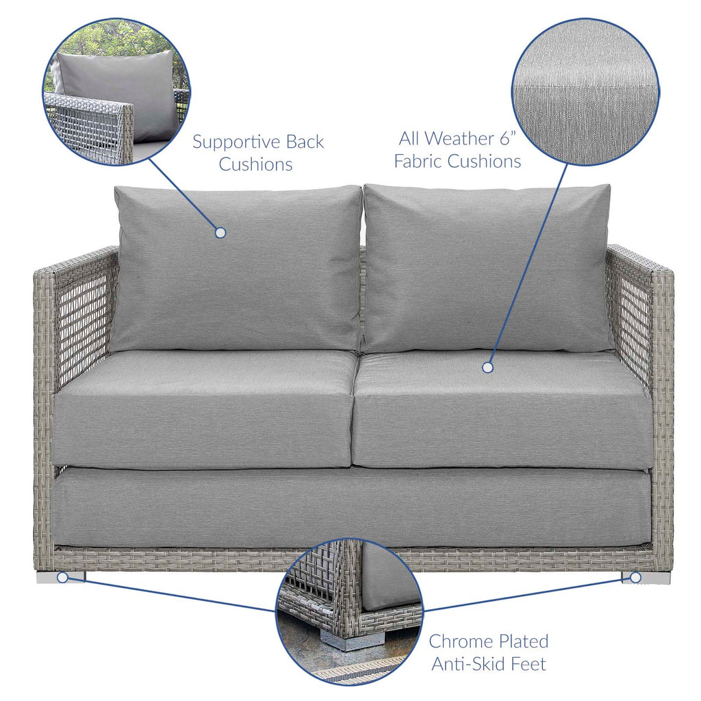 Weave conversational threads into a rollicking good time with Aura Outdoor Patio Collection. Aura comes with a synthetic gray-on-gray tone wicker rattan weave and a powder-coated aluminum frame that delivers a softly versatile outdoor collection that shifts to meet the needs of the moment. Outfitted with machine washable and fade resistant all-weather fabric cushions, and designed with an extra wide and deep body, Aura will make your outdoor spot the focal point of good memories and festive gatherings while enhancing your patio, backyard or poolside arena. Featuring thick cushions and chrome plated anti-skid feet, enjoy spacious seating and enhanced comfort with this reliable piece of outdoor furniture. Comes fully assembled. Set Includes: One - Aura Coffee Table One - Aura Loveseat One - Aura Sofa