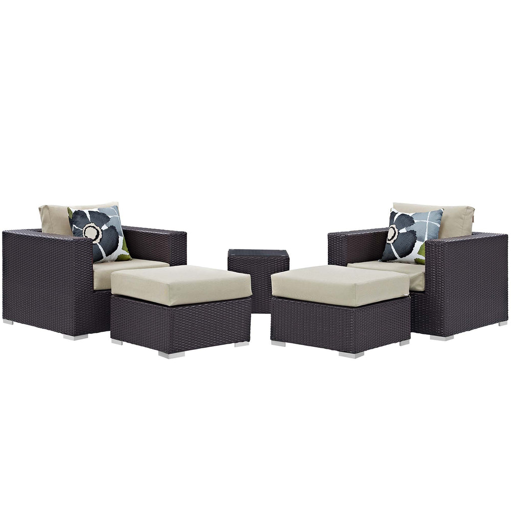 Gather stages of sensitivity with the Convene outdoor sectional series. Made with a synthetic rattan weave and a powder-coated aluminum frame, Convene is a versatile outdoor collection that shifts and combines according to the spontaneous needs of the moment. Outfitted with all-weather fabric cushions, leave a positive impression on friends and family while enhancing your patio, backyard or poolside repast in this series of palpable distinction. This installment of the series is an Outdoor Patio Sectional Set. Set Includes: One - Convene Outdoor Patio Side Table Section Two - Convene Outdoor Patio Armchair Section Two - Convene Outdoor Patio Ottoman Section