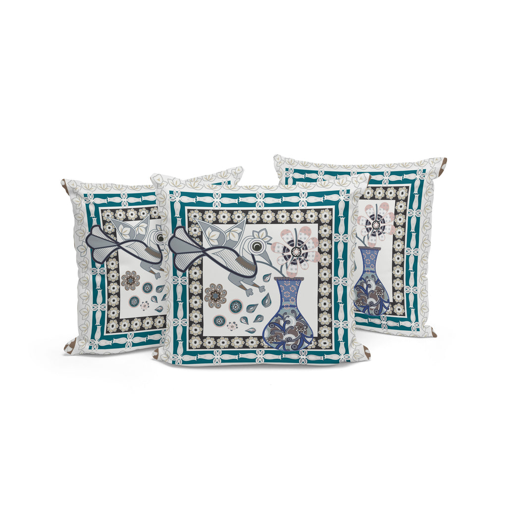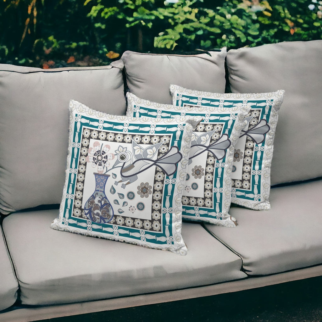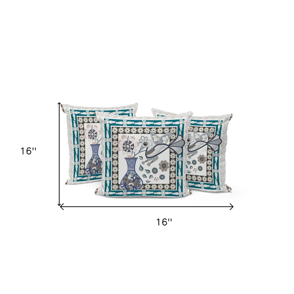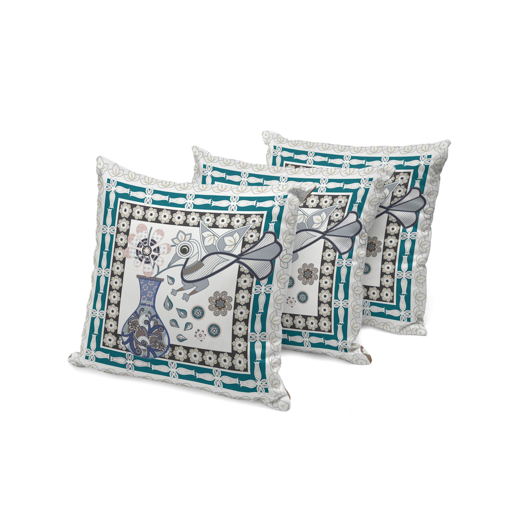 Set of Three 16" X 16" Beige and Green Peacock Blown Seam Floral Indoor Outdoor Throw Pillow