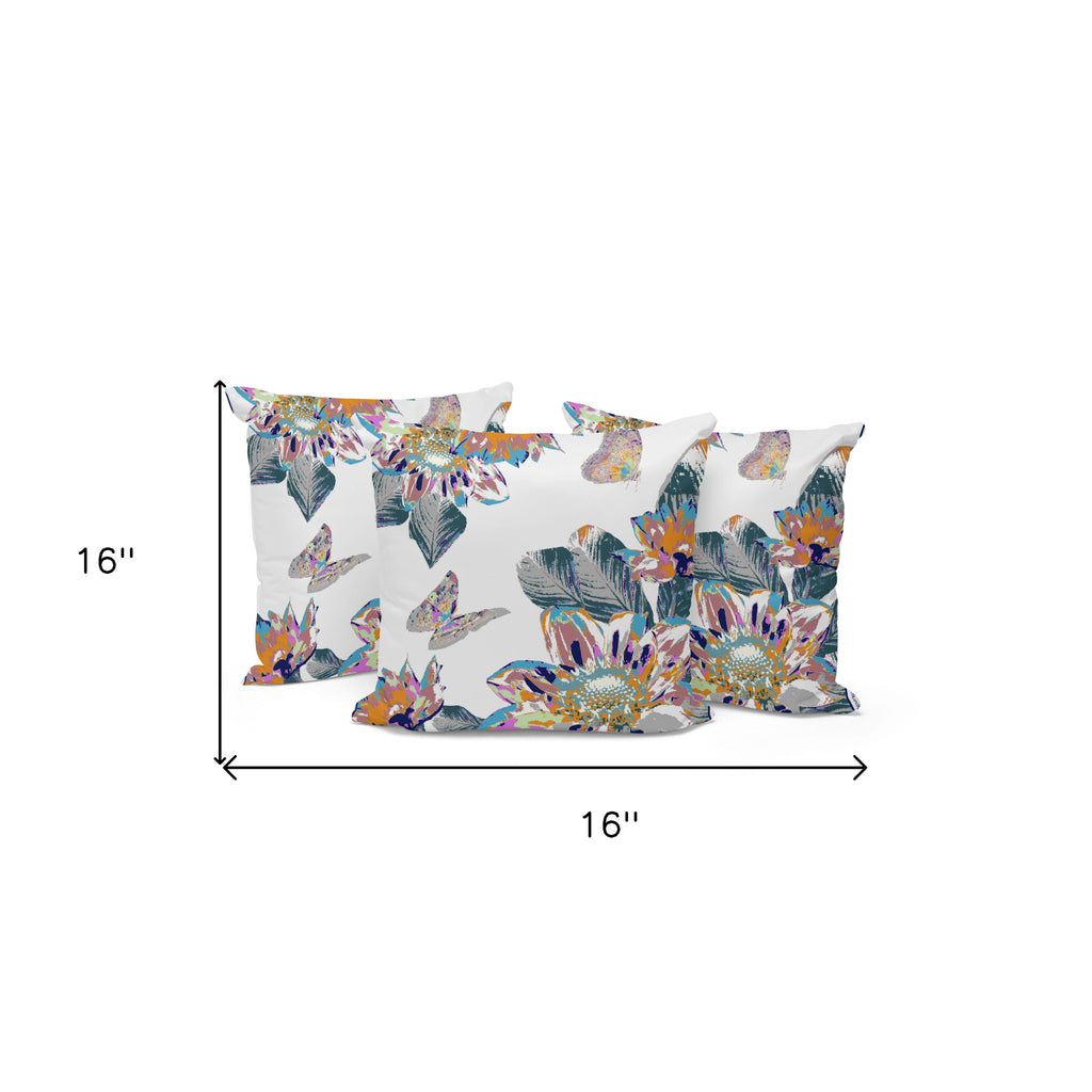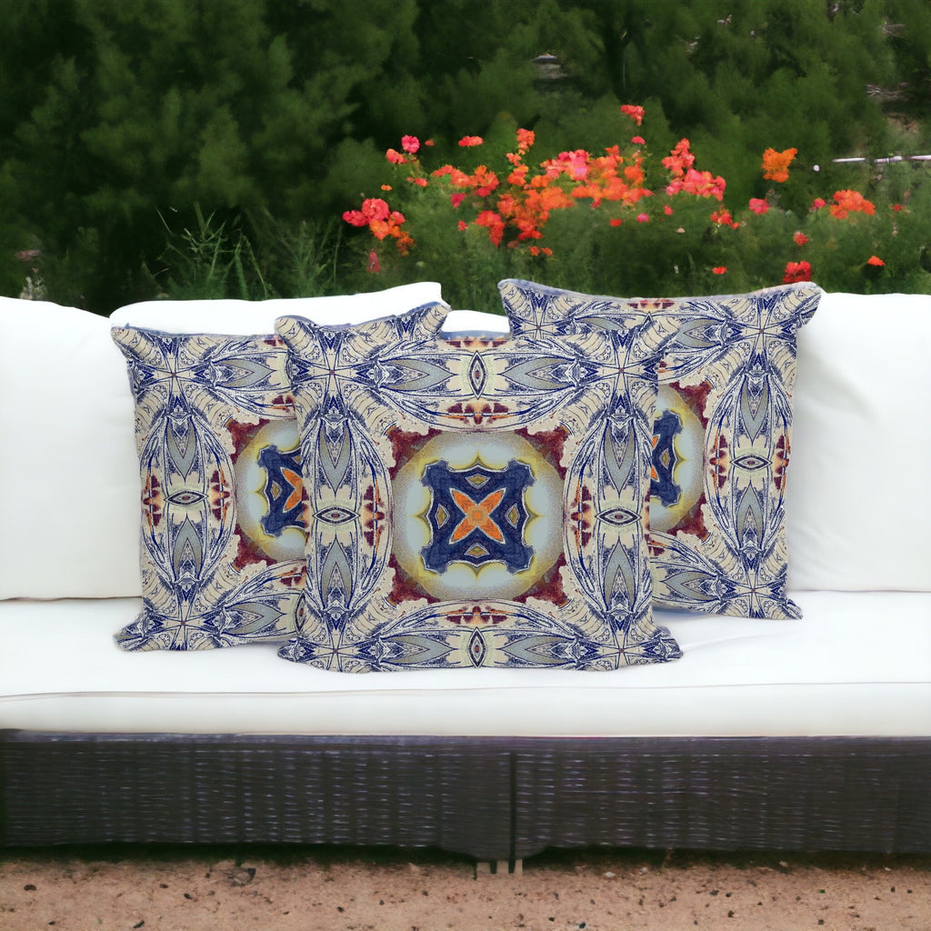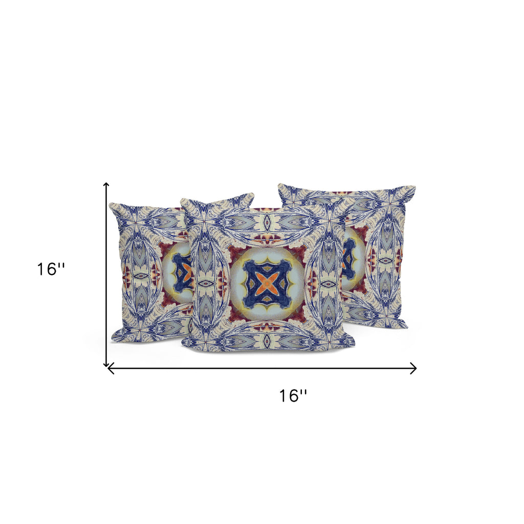 Set of Three 16" X 16" Blue and Gray Blown Seam Floral Indoor Outdoor Throw Pillow