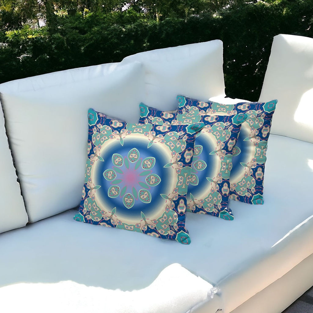 Set of Three 16" X 16" Blue and Green Abstract Indoor Outdoor Throw Pillow