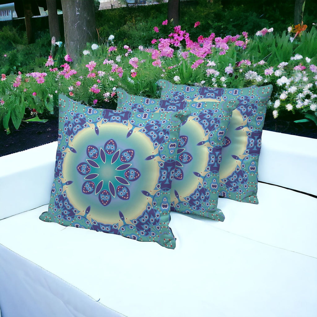 Set of Three 16" X 16" Blue and Purple Abstract Indoor Outdoor Throw Pillow