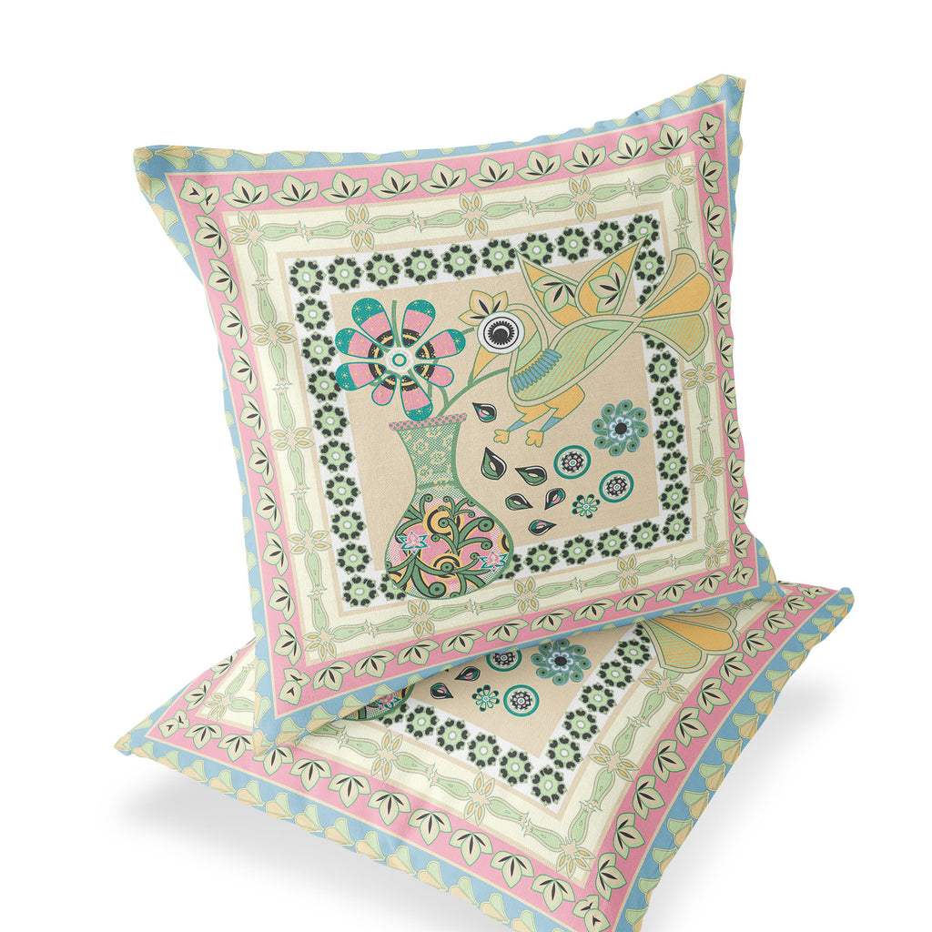 Set of Two 16" X 16" Beige and Pink Peacock Blown Seam Floral Indoor Outdoor Throw Pillow