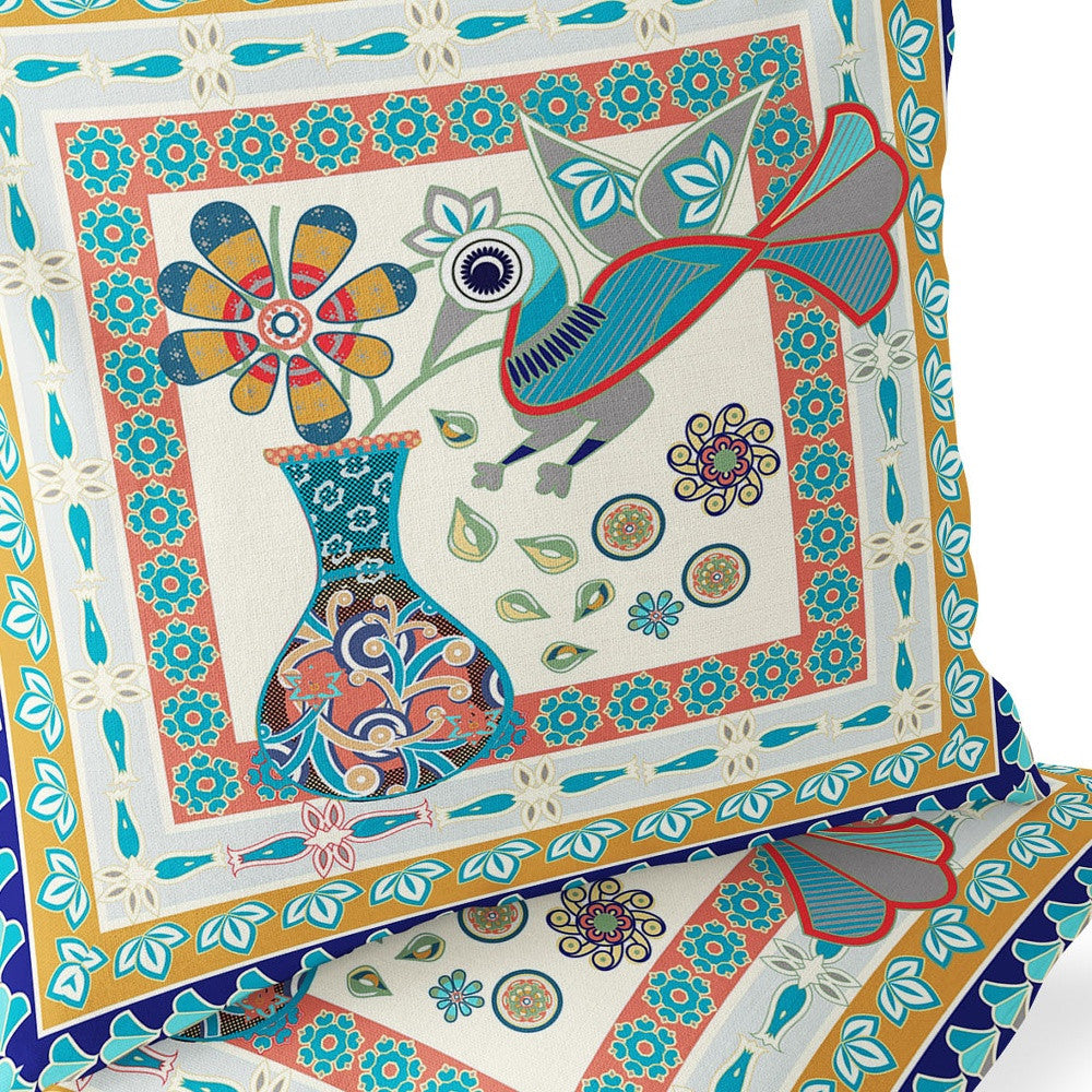 Set of Two 16" X 16" Beige and White Peacock Blown Seam Floral Indoor Outdoor Throw Pillow