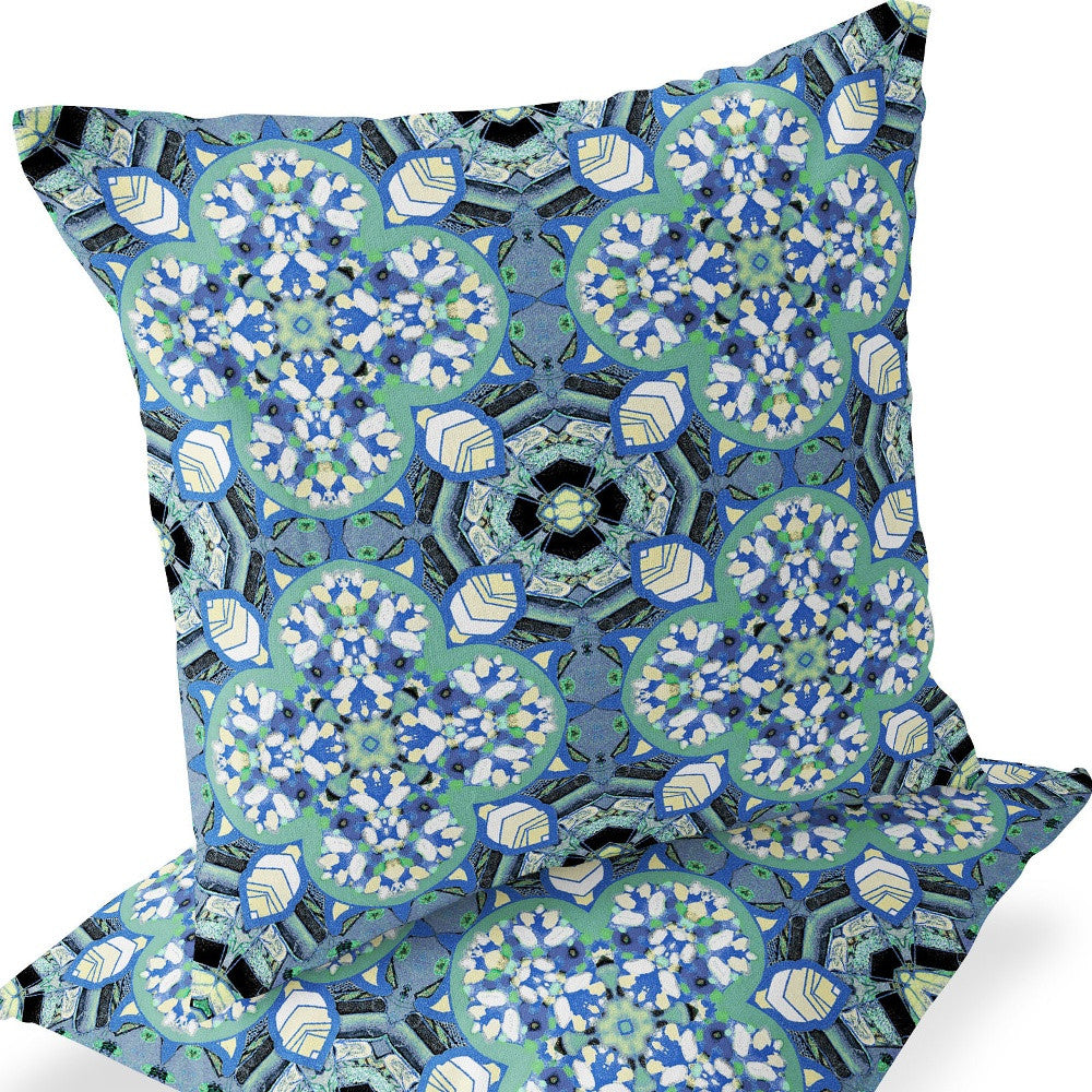 Set of Two 16" X 16" Blue and Black Blown Seam Floral Indoor Outdoor Throw Pillow