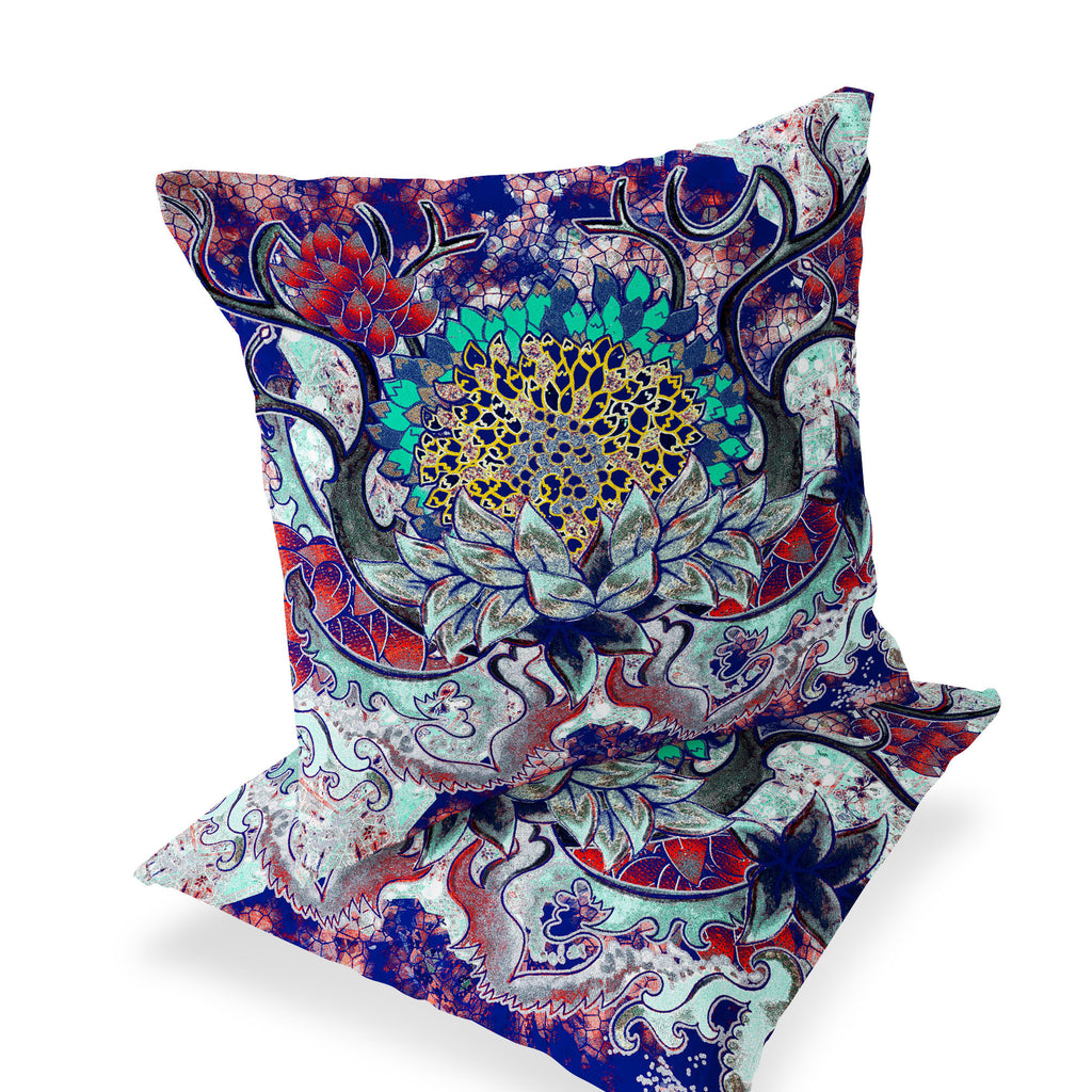 Set of Two 16" X 16" Blue and Green Blown Seam Floral Indoor Outdoor Throw Pillow