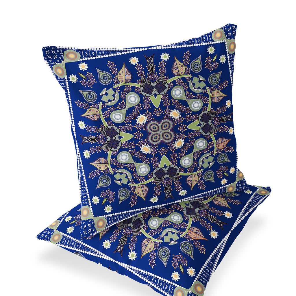 Set of Two 16" X 16" Blue and Green Blown Seam Paisley Indoor Outdoor Throw Pillow