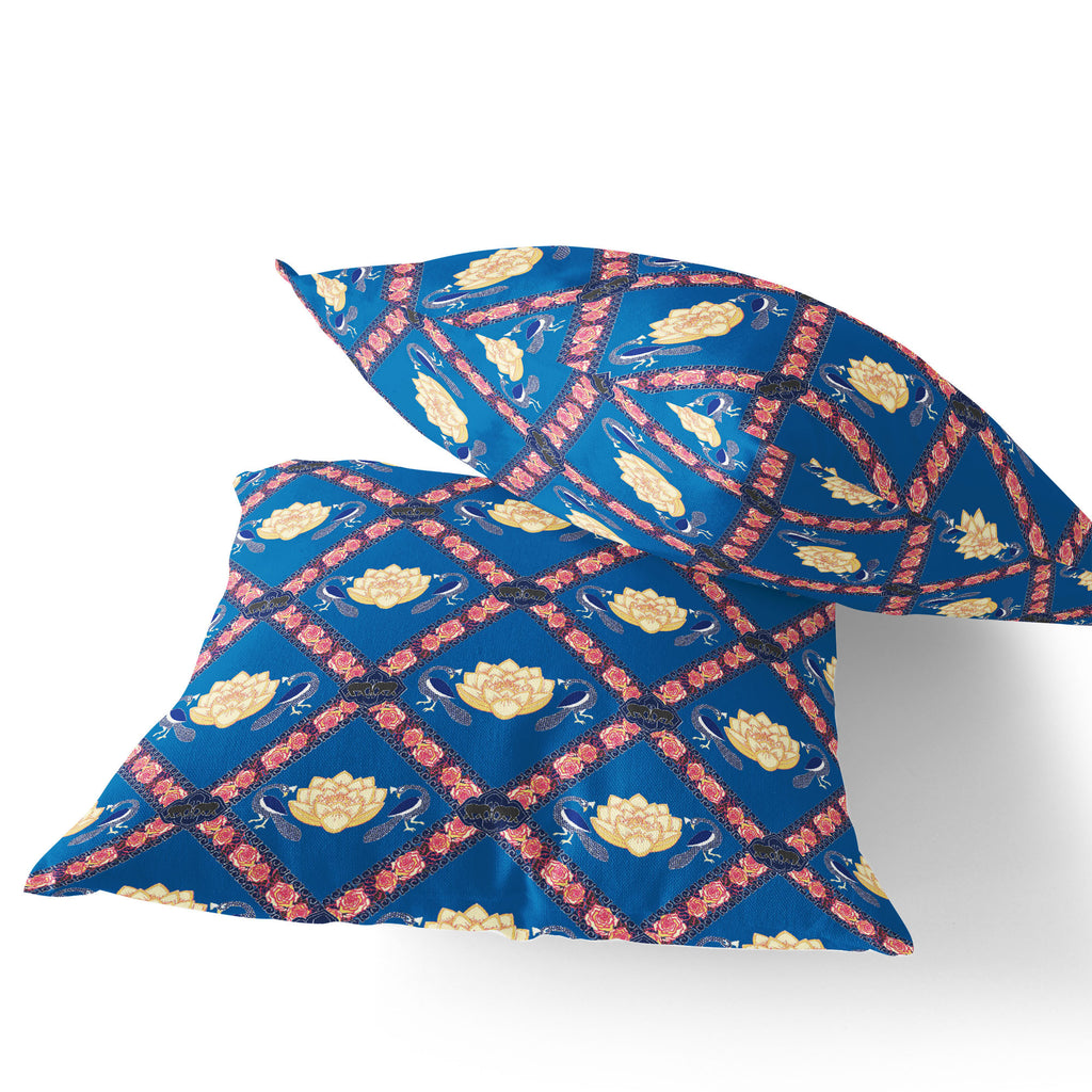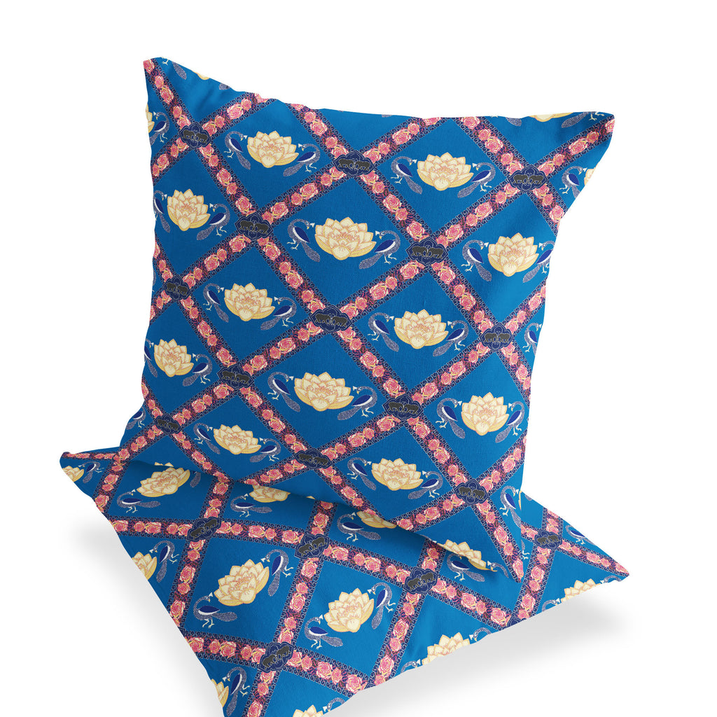Set of Two 16" X 16" Blue and Pink Peacock Blown Seam Floral Indoor Outdoor Throw Pillow