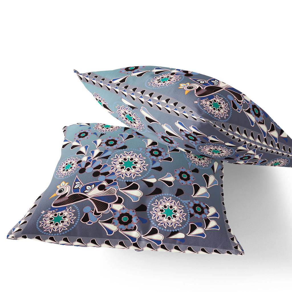 Set of Two 16" X 16" Blue and Purple Peacock Blown Seam Floral Indoor Outdoor Throw Pillow