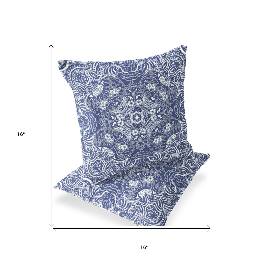 Set of Two 16" X 16" Blue and White Geometric Indoor Outdoor Throw Pillow