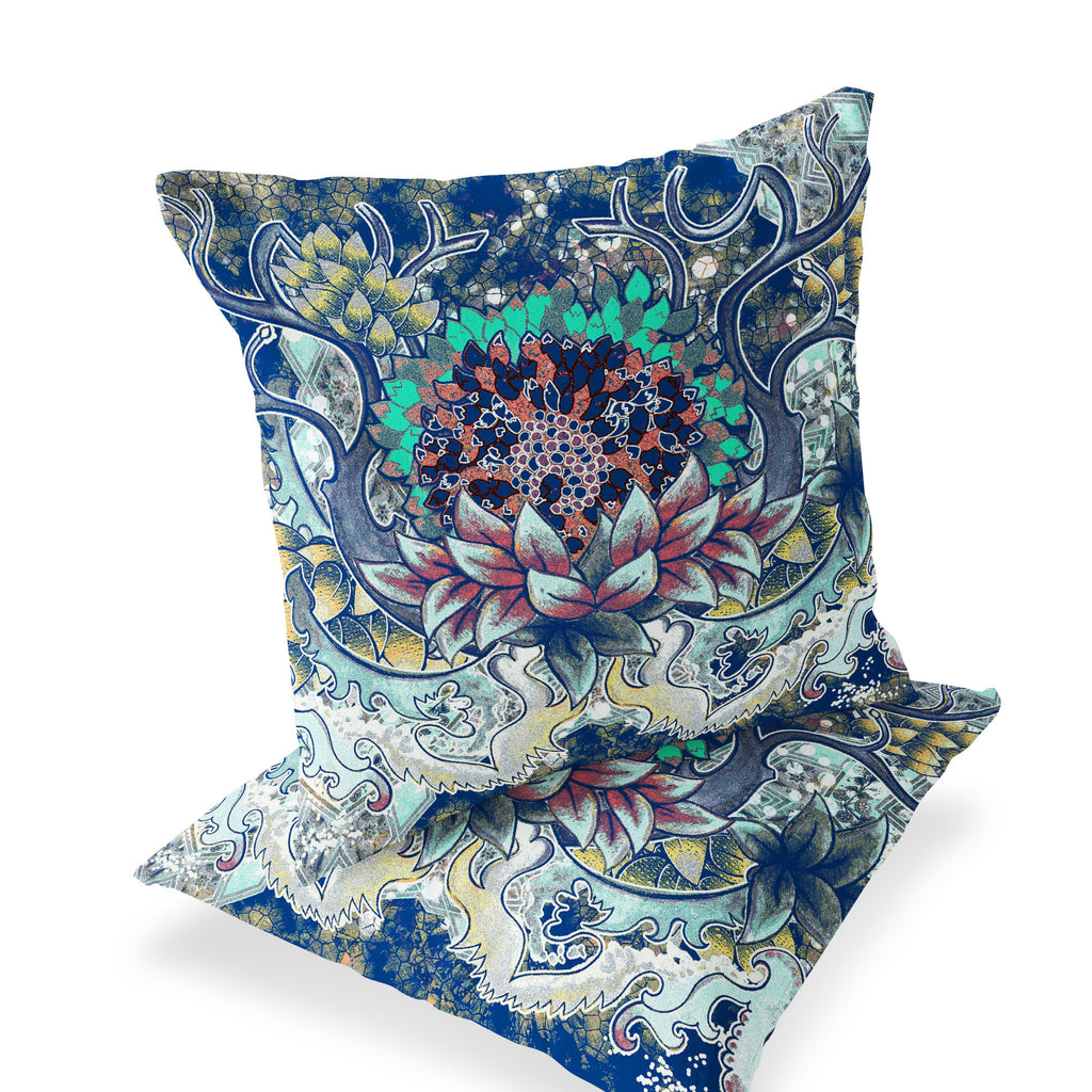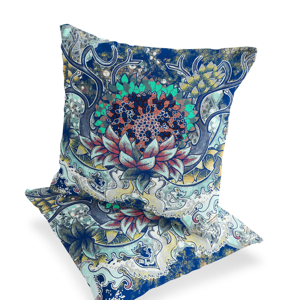 Set of Two 16" X 16" Blue and Yellow Blown Seam Floral Indoor Outdoor Throw Pillow