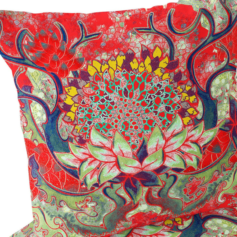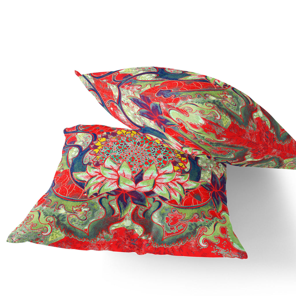 Set of Two 16" X 16" Green and Red Blown Seam Floral Indoor Outdoor Throw Pillow