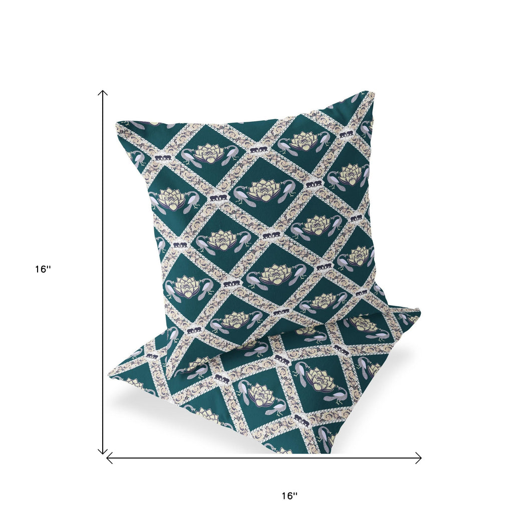 Set of Two 16" X 16" Green and Yellow Peacock Blown Seam Floral Indoor Outdoor Throw Pillow