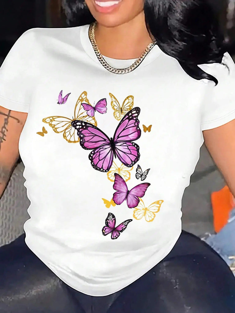 Women's Butterfly Print Round Neck Tee, Fashion Casual Crew Neck T-Shirt for Daily Holiday Vacation Outdoor Wear, Ladies Clothes for Summer