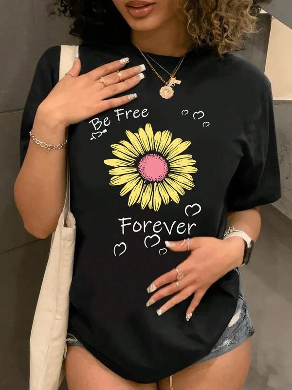 Women's Floral & Letter Print Round Neck Tee, Fashion Casual Crew Neck T-Shirt for Daily Holiday Vacation Outdoor Wear, Ladies Clothes for All Seasonsstyle{n002}2