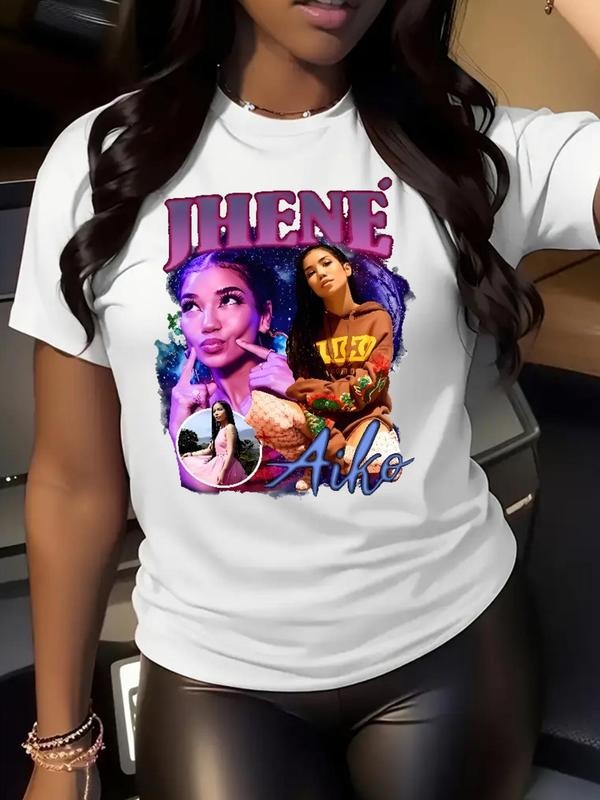 Women's Figure & Letter Print Round Neck Tee, Fashion Casual Crew Neck Short Sleeve T-shirt for Daily Holiday Vacation Outdoor Wear, Ladies Clothes for All Seasons