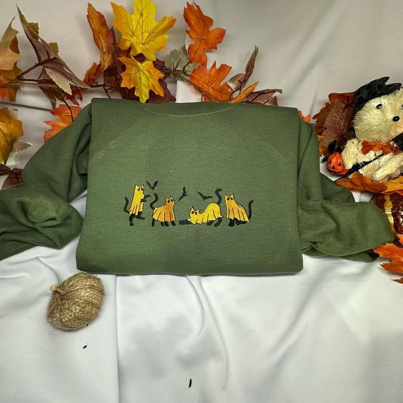 Orange Ghost Cat Embroidered Sweatshirt for Halloween - Orange Ghost cats, Womenswear christmas sweater Hoodie Tops Pullover Long Sleeve Casual Crewneck