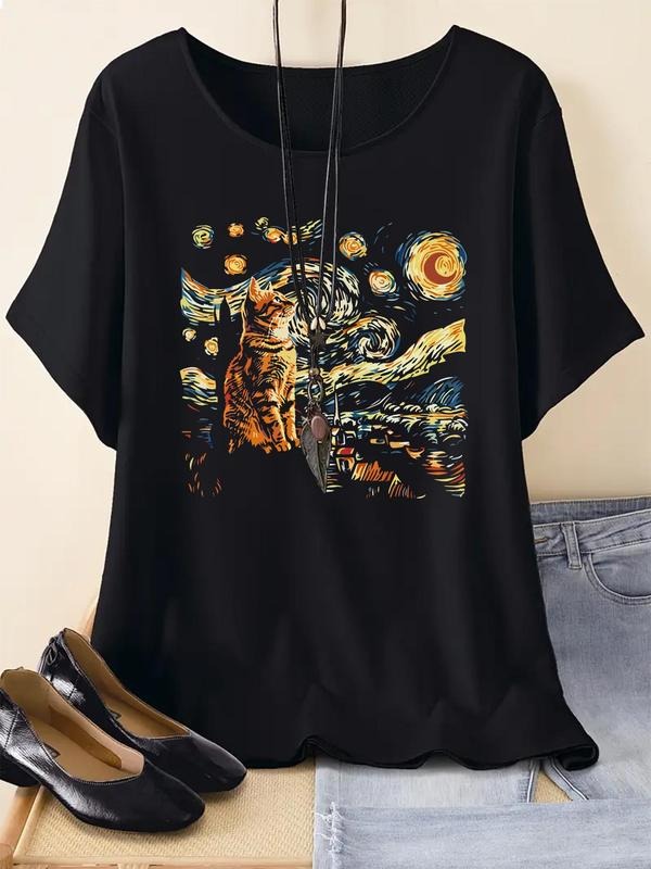 Women's Cat & Starry Night Print Round Neck Tee, Casual Short Sleeve Crew Neck T-Shirt for Summer, Fashion Women's Top for Daily Wear