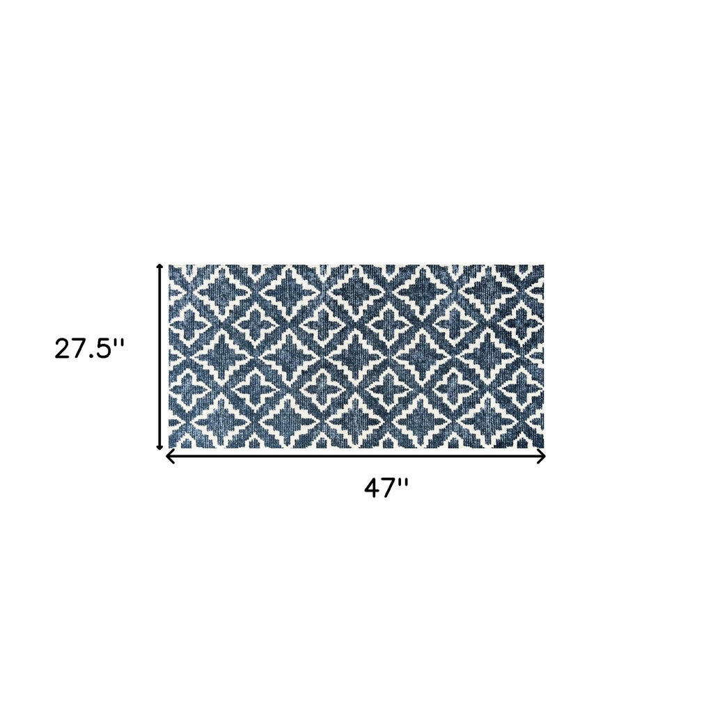 Add some artistry to your room with this 2' x 4' navy blue moroccan machine tufted area rug with uv protection. This rectangle shaped rug features a moroccan design in navy blue to give it visual interest. A classic shape marries with good looking design for your space Ideal for spaces with kids and pets, this rug is stain resistant to help repel stains and spilled liquids. Place this area rug against a hardwood or tile floor and it will enliven your living space with style and sophistication. 0.25" H x 27.5" W x 47" D