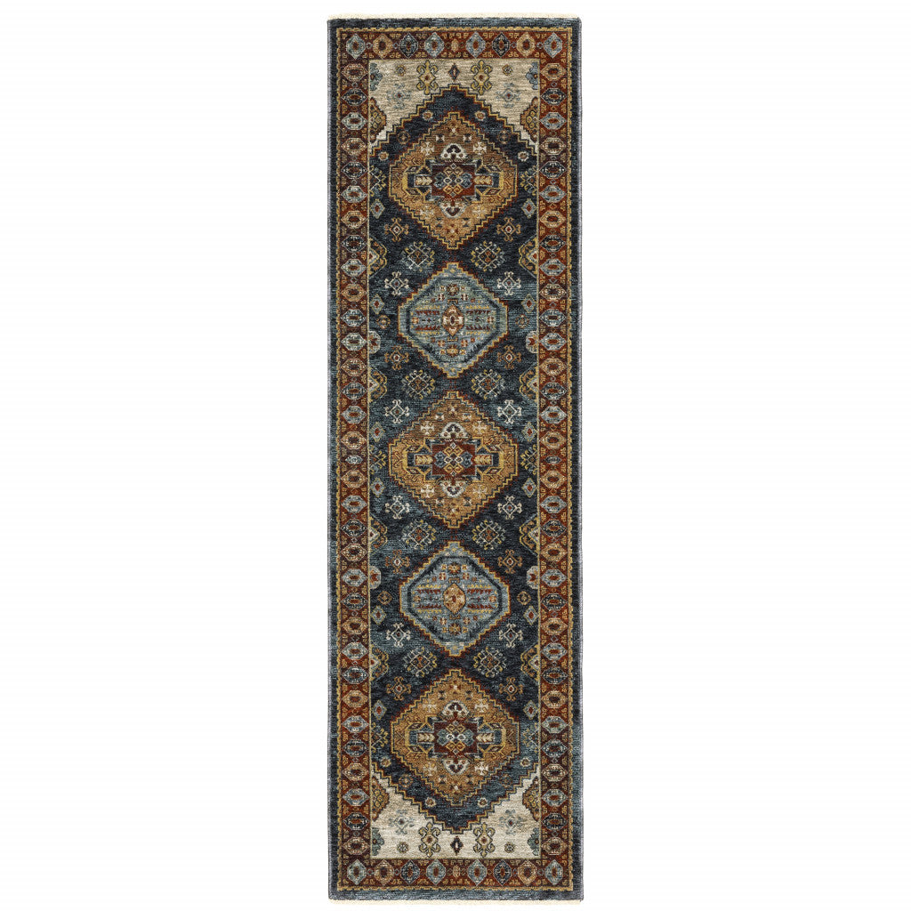 Add great coloration and comfortable texture to your space with this 2' x 8' blue red beige orange gold and tan oriental power loom stain resistant runner rug with fringe. This runner shaped rug features a oriental design in blue red beige orange gold and tan to give it visual interest. A classic shape marries with good looking design for your space Ideal for spaces with kids and pets, this rug is stain resistant to help repel stains and spilled liquids. Tassel ends bring a timeless and fashionable look to your interior. Area Rugs help to give warmth and sense of home to your space. 0.24" H x 26.77" W x 92.52" D