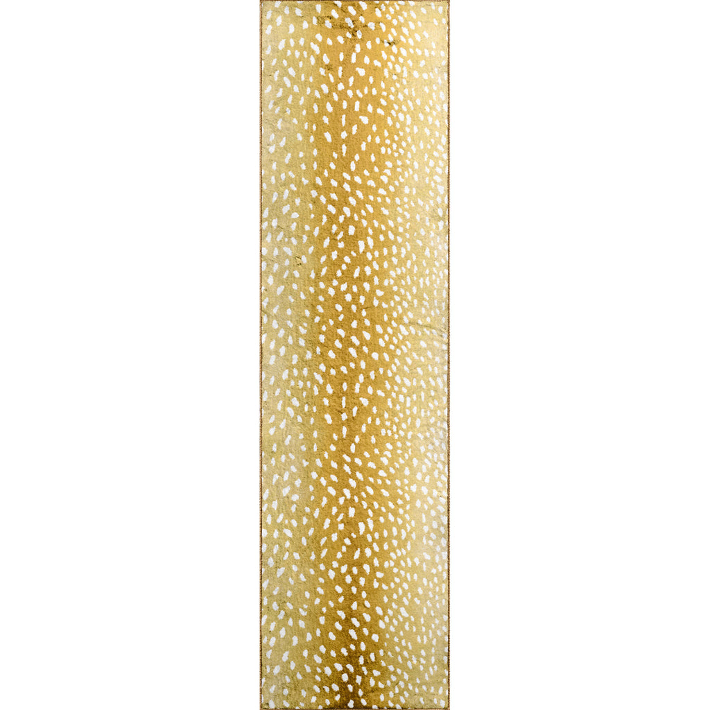 Add great coloration and comfortable texture to your space with this 2' x 8' gold animal print shag handmade non skid runner rug. This runner shaped rug features a animal print design in gold to give it visual interest. A classic shape marries with good looking design for your space The retro shag construction of this luxurious rug will provide a soft and comfortable barrier to color tile and hardwood floors. Place this area rug against a hardwood or tile floor and it will enliven your living space with style and sophistication. 0.86" H x 24" W x 90" D