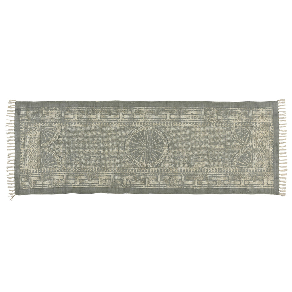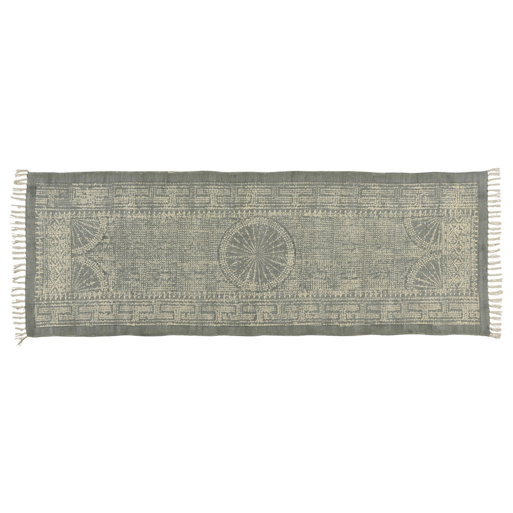 Give your home an instant update with this Sky Gray Distressed Medallion Runner Rug that creates an understated elegance with its neutral color palette. The intricate design patterns all over with a central medallion in ivory are block printed on a sky-gray background, creating an aesthetically pleasing harmony. The ivory cotton strands are beautifully knotted on both ends into equal-sized tassels as decorative accents. Carefully crafted with 100% cotton, this rug is not only easy to clean but also has a super soft and smooth surface texture that feels lustrous under the feet making it an ideal piece for indoor areas with medium foot traffic. Without question, the subtle undertone of this runner rug will add depth to your living space while complementing the accent colors of your modern interior decors. 0.25” x 96” x 30”