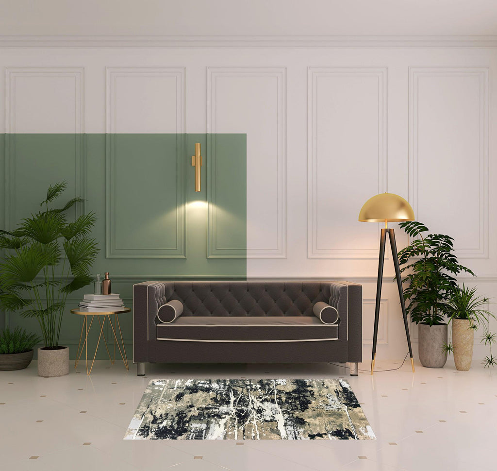 This 4' x 6' black gold grey and ivory abstract power loom stain resistant area rug, is a great way to add warmth to a room. This rectangle shaped rug features a abstract design in black gold grey and ivory to give it visual interest. A classic shape marries with good looking design for your space Ideal for spaces with kids and pets, this rug is stain resistant to help repel stains and spilled liquids. Place this area rug against a hardwood or tile floor and it will enliven your living space with style and sophistication. 0.39" H x 46.06" W x 64.96" D