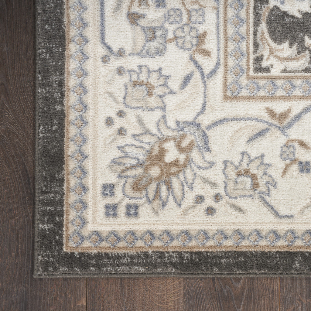 This 5-foot x 7-foot gray floral distressed area rug, is a great way to add warmth to a room. This rectangle shaped rug features a floral design in gray to give it visual interest. A classic shape marries with good looking design for your space the coloring of this rug adds a delightfully neutral tone to your home and will easily match with most any decor. Area rugs help to give warmth and sense of home to your space. 63-inch H x 87-inch W x 0.35-inch D