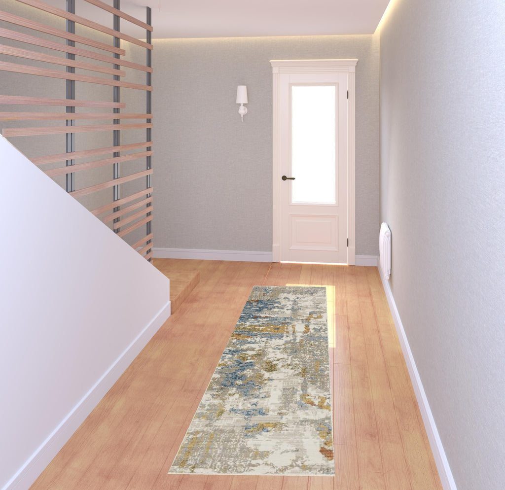 Add great coloration and comfortable texture to your space with this 8' beige grey gold blue rust and teal abstract power loom runner rug with fringe. This runner shaped rug features a abstract design in beige grey gold blue rust and teal to give it visual interest. A classic shape marries with good looking design for your space Ideal for spaces with kids and pets, this rug is stain resistant to help repel stains and spilled liquids. Tassel ends bring a timeless and fashionable look to your interior. Place this area rug against a hardwood or tile floor and it will enliven your living space with style and sophistication. 0.31" H x 26.77" W x 90.55" D