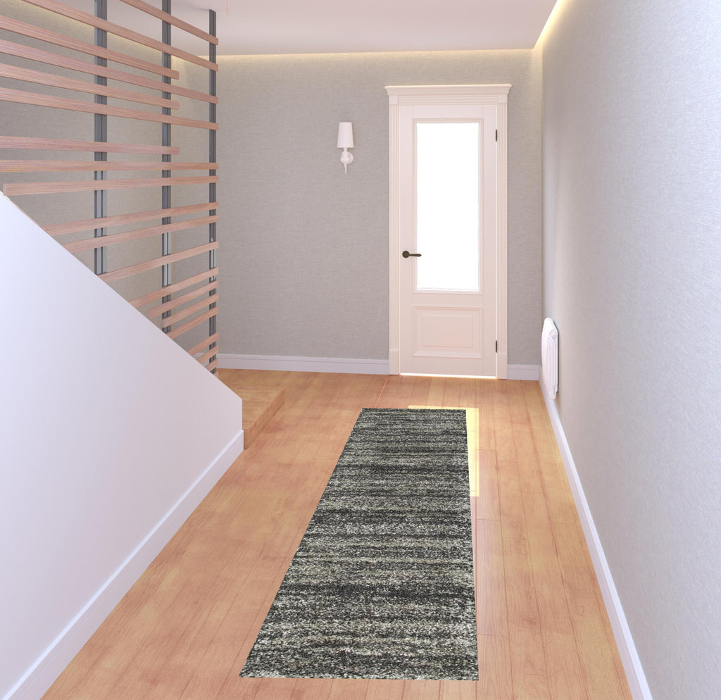Add some artistry to your room with this 8-foot black and gray geometric shag power loom runner rug. This runner shaped rug features a geometric design in black and gray to give it visual interest. A classic shape marries with good looking design for your space ideal for spaces with kids and pets, this rug is stain resistant to help repel stains and spilled liquids. The retro shag construction of this luxurious rug will provide a soft and comfortable barrier to color tile and hardwood floors. Area rugs help to give warmth and sense of home to your space. 1.96-inch H x 26.77-inch W x 90.55-inch D