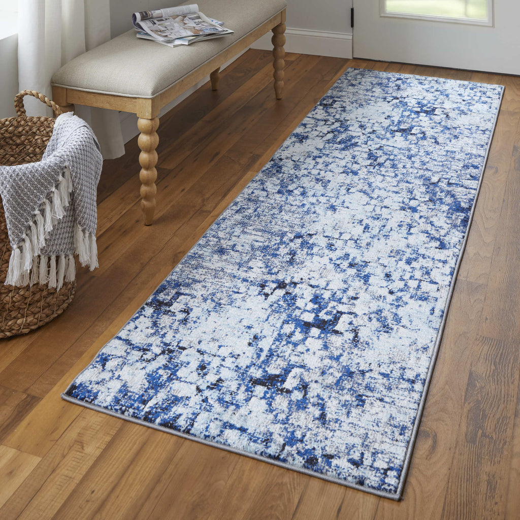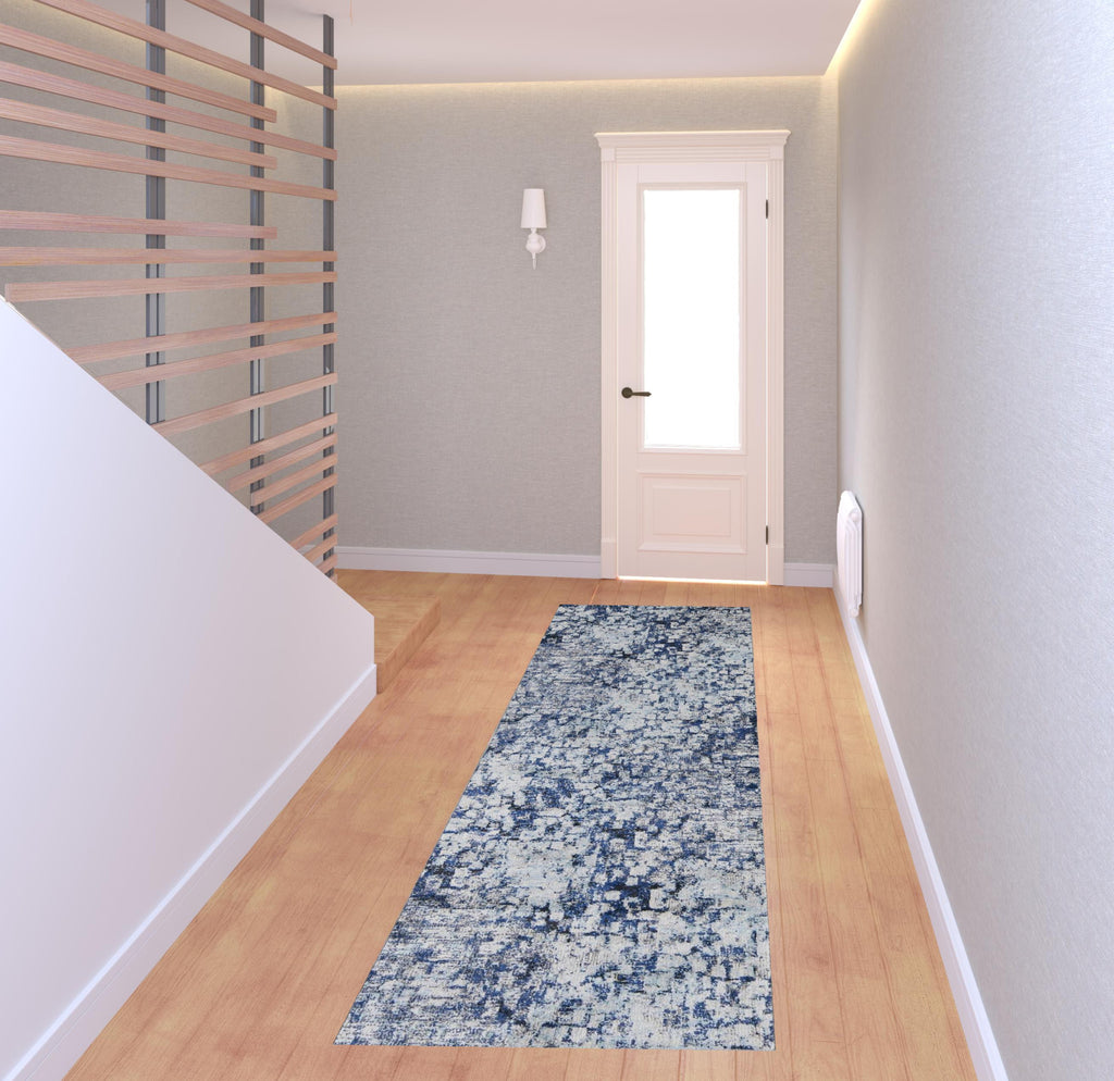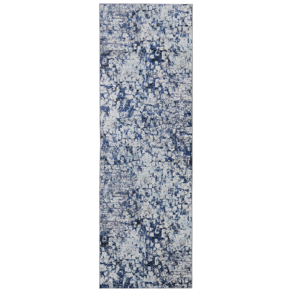 Add great coloration and comfortable texture to your space with this 8' blue and ivory abstract power loom distressed runner rug. This runner shaped rug features a abstract design in blue and ivory to give it visual interest. A classic shape marries with good looking design for your space This superior Turkish rug represents the highest quality and is built to last. Ideal for spaces with kids and pets, this rug is stain resistant to help repel stains and spilled liquids. Place this area rug against a hardwood or tile floor and it will enliven your living space with style and sophistication. 0.39" H x 32" W x 96" D