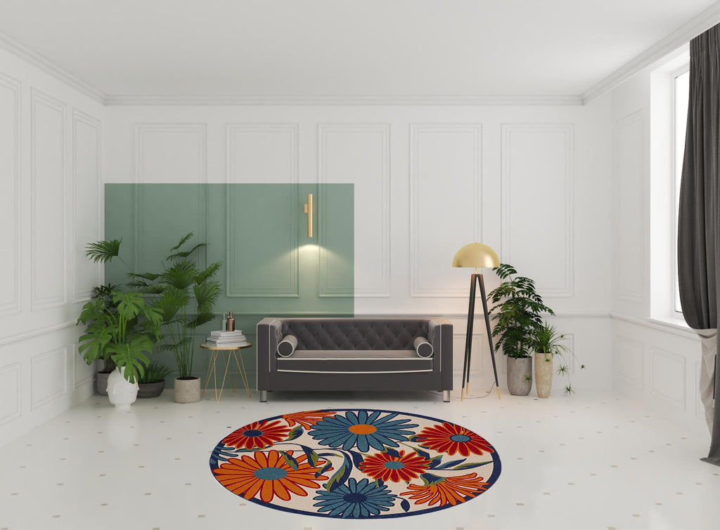 8' Blue and Orange Round Floral Power Loom Area Rug