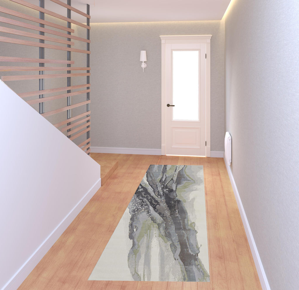 Add some artistry to your room with this 8' green purple and ivory abstract power loom runner rug. This runner shaped rug features a abstract design in green purple and ivory to give it visual interest. A classic shape marries with good looking design for your space This superior Turkish rug represents the highest quality and is built to last. Area Rugs help to give warmth and sense of home to your space. 0.39" H x 33" W x 94" D