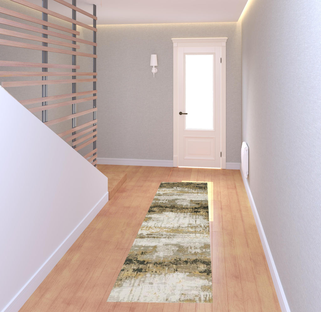 Add some artistry to your room with this 8' grey gold black charcoal and beige abstract power loom runner rug with fringe. This runner shaped rug features a abstract design in grey gold black charcoal and beige to give it visual interest. A classic shape marries with good looking design for your space Ideal for spaces with kids and pets, this rug is stain resistant to help repel stains and spilled liquids. Tassel ends bring a timeless and fashionable look to your interior. Area Rugs help to give warmth and sense of home to your space. 0.31" H x 26.77" W x 90.55" D