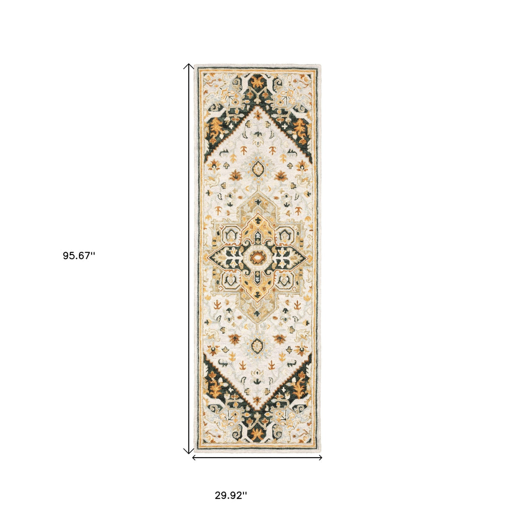 8' Ivory and Black Oriental Handmade Runner Rug