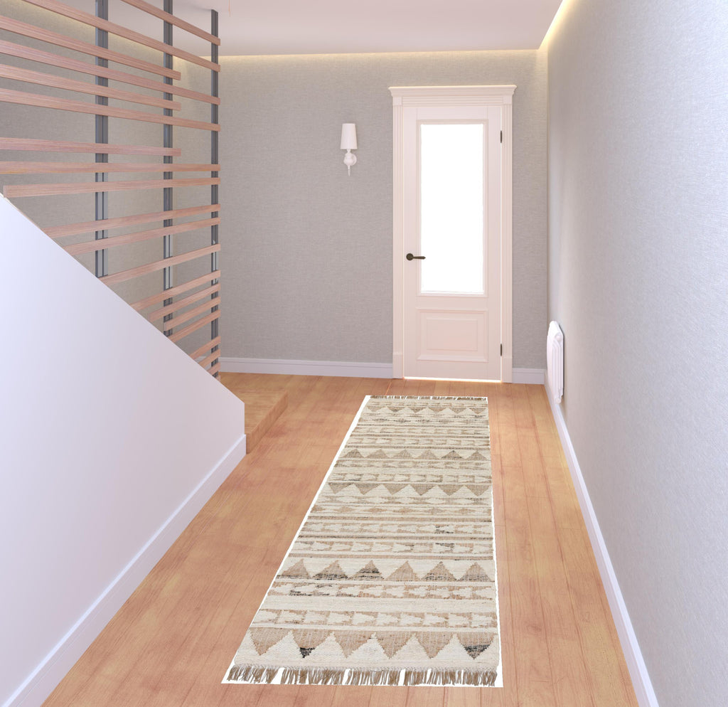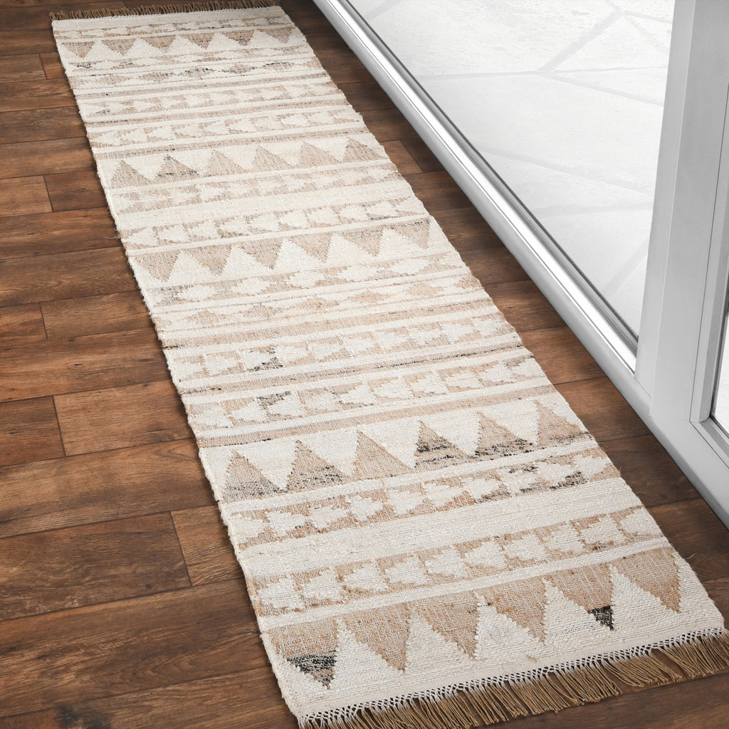 Add some artistry to your room with this 8-foot natural and ivory southwestern hand woven distressed runner rug with fringe. This runner shaped rug features a southwestern design in natural and ivory to give it visual interest. A classic shape marries with good looking design for your space ideal for spaces with kids and pets, this rug is stain resistant to help repel stains and spilled liquids. Tassel ends bring a timeless and fashionable look to your interior. Crafted by skilled artisans, this hand woven rug is genuine and unique. No two will be exactly alike. Place this area rug against a hardwood or tile floor and it will enliven your living space with style and sophistication. 0.25-inch H x 31.2-inch W x 96-inch D