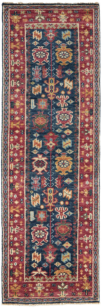 Set an inviting tone in your space with this 8' pink blue and orange wool floral hand knotted distressed stain resistant runner rug with fringe. This runner shaped rug features a floral design in pink blue and orange to give it visual interest. A classic shape marries with good looking design for your space Ideal for spaces with kids and pets, this rug is stain resistant to help repel stains and spilled liquids. Tassel ends bring a timeless and fashionable look to your interior. Crafted by skilled artisans, this hand knotted rug is genuine and unique. No two will be exactly alike. Place this area rug against a hardwood or tile floor and it will enliven your living space with style and sophistication. 0.28" H x 30" W x 96" D