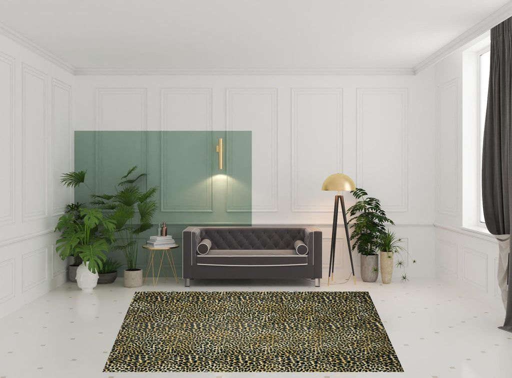 Add some artistry to your room with this 8' x 10' black and gold animal print shag handmade non skid area rug. This rectangle shaped rug features a animal print design in gold to give it visual interest. A classic shape marries with good looking design for your space The retro shag construction of this luxurious rug will provide a soft and comfortable barrier to color tile and hardwood floors. Place this area rug against a hardwood or tile floor and it will enliven your living space with style and sophistication. 0.86" H x 96" W x 120" D