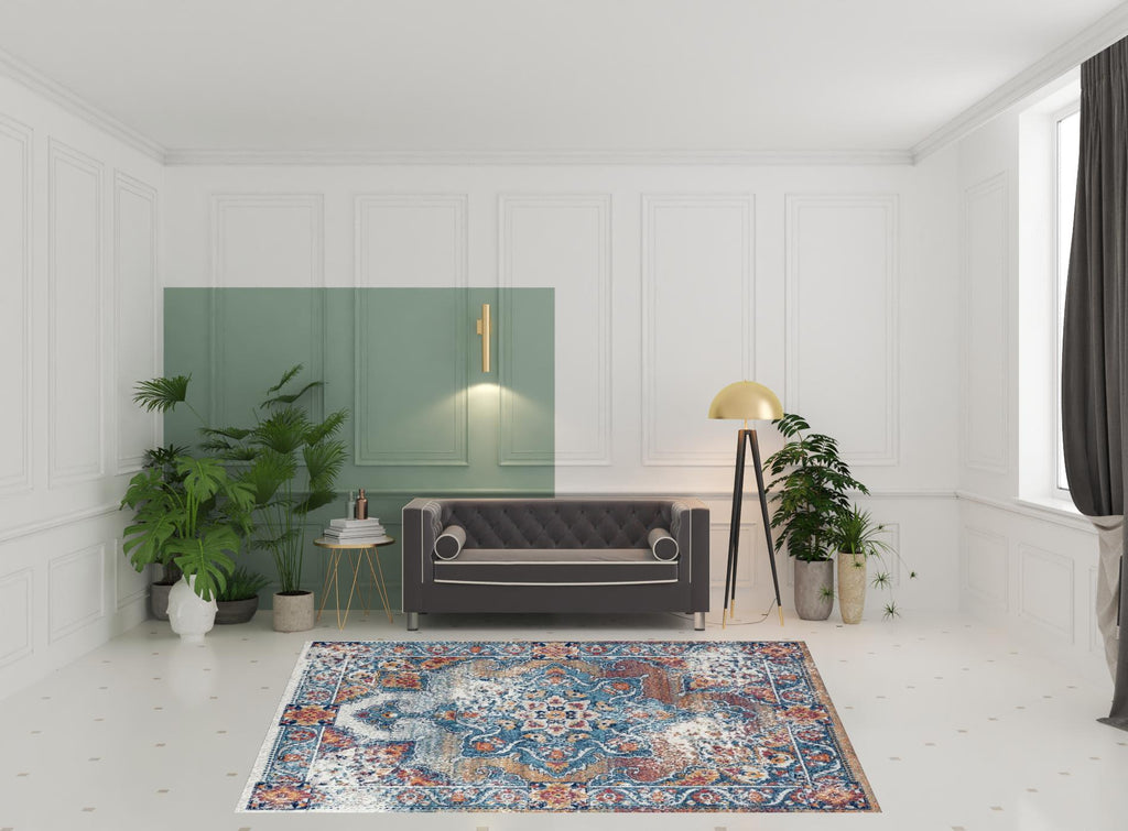 This 8 feet x 10 feet orange medallion power loom area rug, is a great way to add warmth to a room. This rectangle shaped rug features a medallion design in orange to give it visual interest. A classic shape marries with good looking design for your space Ideal for spaces with kids and pets, this rug is stain resistant to help repel stains and spilled liquids. Place this area rug against a hardwood or tile floor and it will enliven your living space with style and sophistication. 0.38 inches H x 93 inches W x 117 inches D