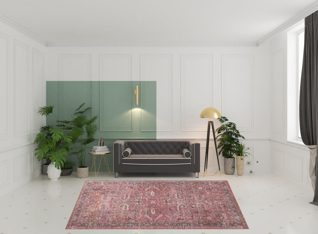 This 8' x 10' red floral power loom distressed area rug, is a great way to add warmth to a room. This rectangle shaped rug features a floral design in red to give it visual interest. A classic shape marries with good looking design for your space This superior Turkish rug represents the highest quality and is built to last. Place this area rug against a hardwood or tile floor and it will enliven your living space with style and sophistication. .28" H x 94.00" W x 118.00" D