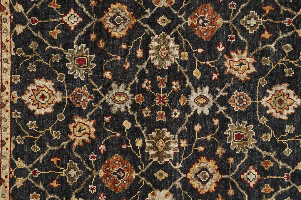 This 9' x 12' black gold and gray wool floral hand knotted stain resistant area rug with fringe, is a great way to add warmth to a room. This rectangle shaped rug features a floral design in black gold and gray to give it visual interest. A classic shape marries with good looking design for your space Ideal for spaces with kids and pets, this rug is stain resistant to help repel stains and spilled liquids. Tassel ends bring a timeless and fashionable look to your interior. Crafted by skilled artisans, this hand knotted rug is genuine and unique. No two will be exactly alike. Place this area rug against a hardwood or tile floor and it will enliven your living space with style and sophistication. 0.28" H x 102" W x 138" D
