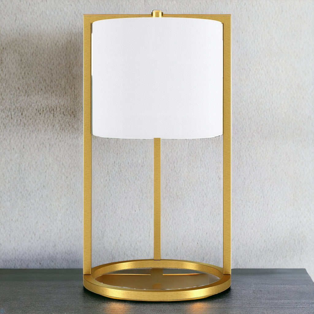 Add a bright anchor to your room with this 22-inch brass metal table lamp with white drum shade. The lamp is made of sturdy metal and features a brass color. The white drum fabric shade is finishes this piece off nicely and symmetrically this standard table lamp is designed to provide general lighting to the area. High quality design makes this a great lamp for not only lighting, but accenting a room with style. It is perfect for virtually any decor. 22-inch H x 12-inch W x 12-inch D
